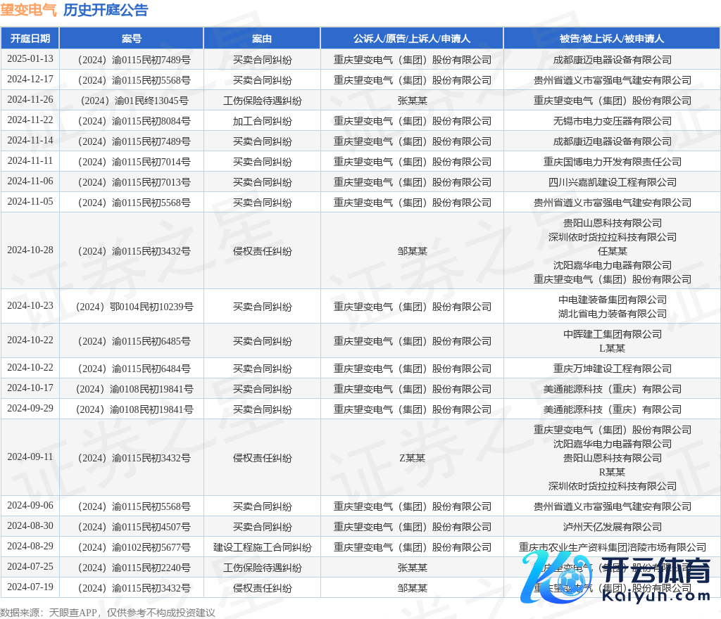 本站音讯,字据天眼查APP露馅,近日公布了一则重庆望变电气(集团)股份有限公司行为被告/被上诉东说念主的开庭公告开yun体育网,刺目履行如下: