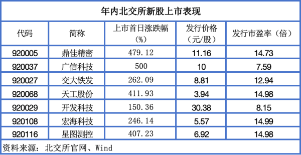 本年以来欧洲杯体育,北交所新股商场行情抓续火热,近期上市的鼎佳精密(920005.BJ)又交出了亮眼的首秀收获。 据走漏,鼎佳精密于上月底登陆北交所,刊行价为11.16元/股,刊行市盈率为14.73倍,上市首日收涨479.12%,成为本年以来北交所商场涨幅第二高的新股。另据Wind统计,本年前7月,北交所商场迎来7只新股,其中4股上市首日涨超400%,涨幅居首的是广信科技(920037.BJ),首日涨幅500%。 举座来看,这些首秀收获可喜的北交所新股,大多具有刊行价钱或刊行市盈率低的上风。举